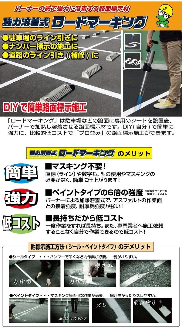 | シートを設置後、バーナー(別売)で加熱し溶着させるタイプの路面標示材です。加工用シートはハサミで簡単にカットできるためオリジナルのマークが手軽に作成できます。 |