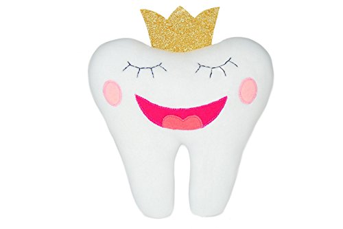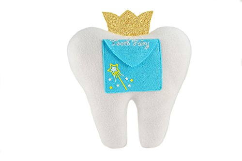 EMBROIDERED TOOTH SHAPED PILLOW measures 9" x 8" and is made of high quality soft felt and features a pocket on the back with velcro closure to keep the tooth and money secure.