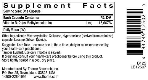 -. Binding : Health and Beauty -. Brand : Thorne Research -. Feature : * made without flowing agents that can inhibit bioavailability / * without preservatives, magnesium stearate, or other lubricants and diluents / * supports cardiovascular health, nerve function, and sleep* / * an active form of vitamin B12 more readily used by the body* -. Label : Thorne Research -. Manufacturer : Thorne Research -. MPN : B125 -. PartNumber : B125 -. ProductGroup : Health and Beauty -. ProductTypeName : HEALTH_PERSONAL_CARE -. Publisher : Thorne Research -. Studio : Thorne Research -. Title : THORNE RESEARCH - Methylcobalamin - 60's [Misc.] [Health and Beauty]