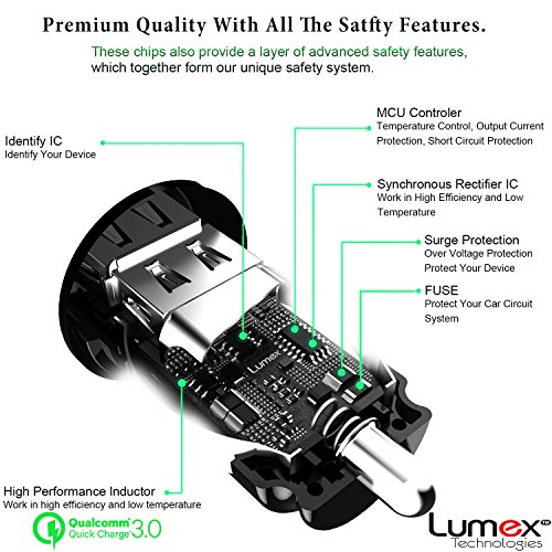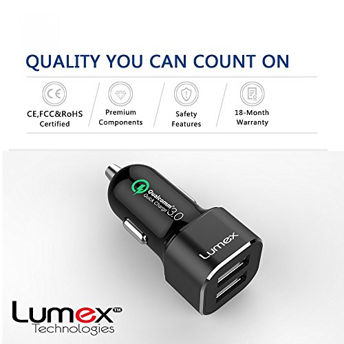Lumex 2-Port USB Car Charger 5.4A/39W Quick Charge 3.0 Dual USB Ports 2.4 & 3.0 for iPhone 7 / 6s / 6 / 6 Plus, iPad Air 2 / mini 3, Galaxy S6 / Edge / Plus, Note 5, Bluetooth Headsets, GPS and More