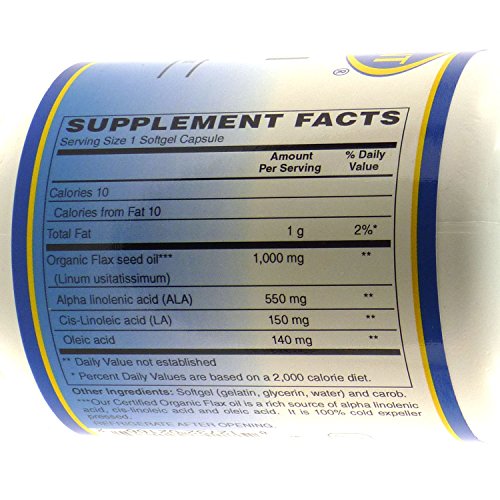 Studio : Vitamin Discount Center Publisher : Vitamin Discount Center Product Description Flax Oil is a natural reservoir for the omega-3 fatty acid, alpha -linolenic acid (ALA). Our Certified Organic Flax oil is a rich source of alpha linolenic acid, cis-linoleic acid and oleic acid. It is 100% cold expeller pressed. As a dietary supplement, adults take one (1) softgel capsule, one (1) or two (2) times daily with meals, or as directed by a health care professional. Store in a cool, dry place and away from direct light. These statements have not been evaluated by the Food and Drug Administration. This product is not intended to diagnose, treat, cure, or prevent any disease. 0