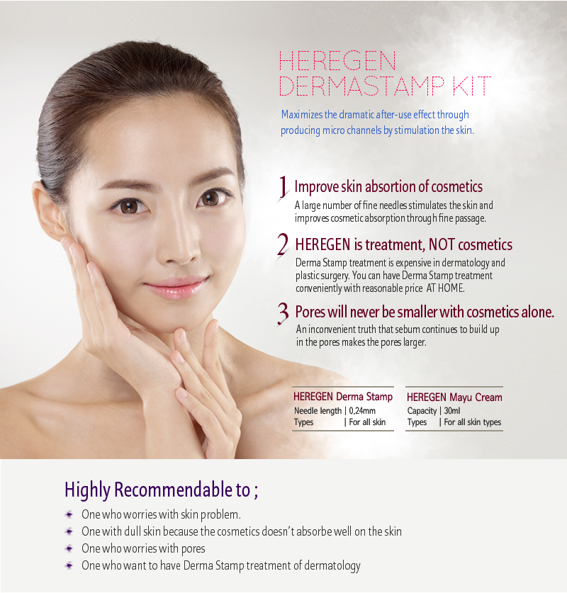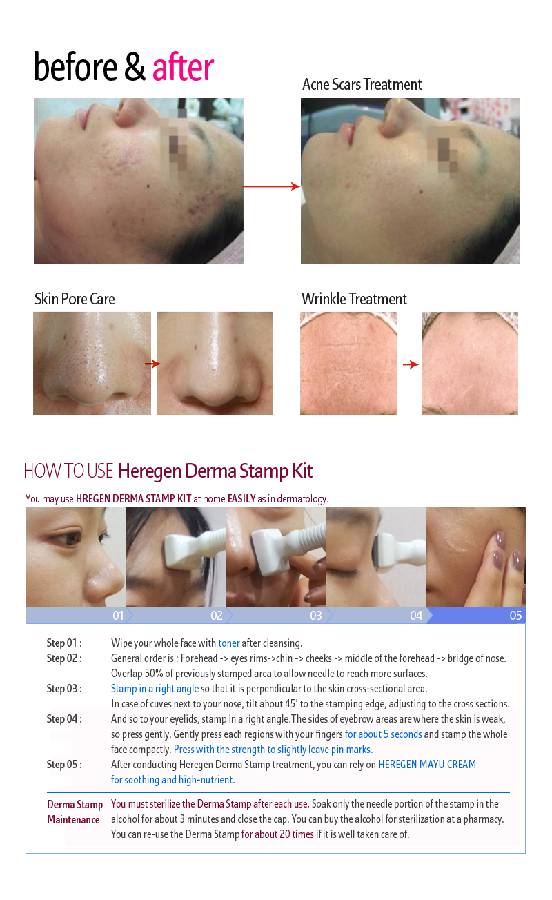 You may use HREGEN DERMA STAMP KIT at home easily as in dermatology. This is the hottest in Korea which have sold over one million kit. |
