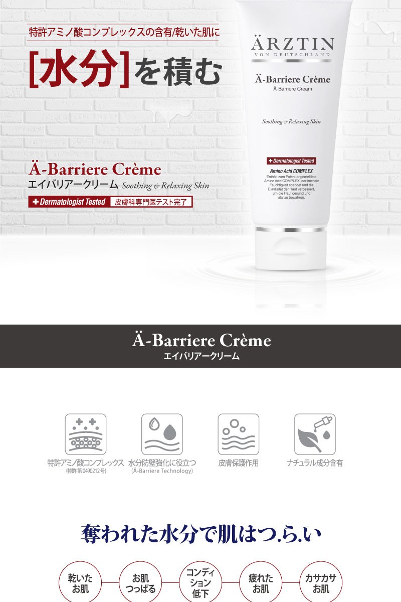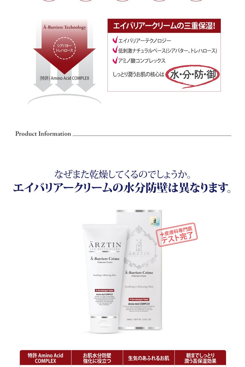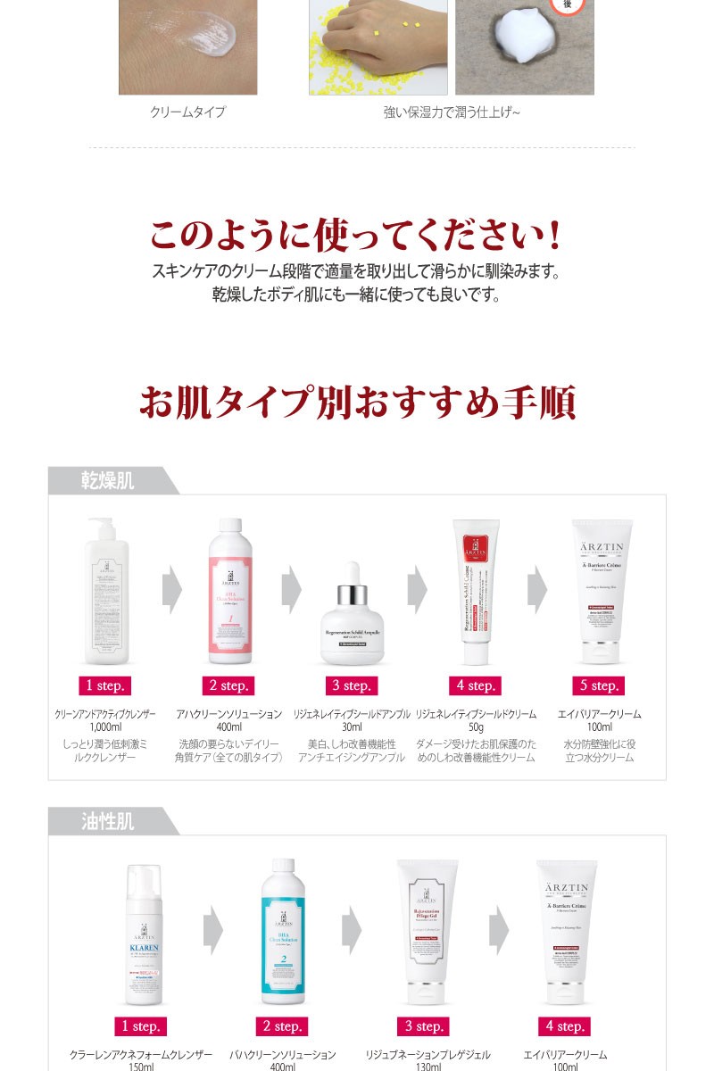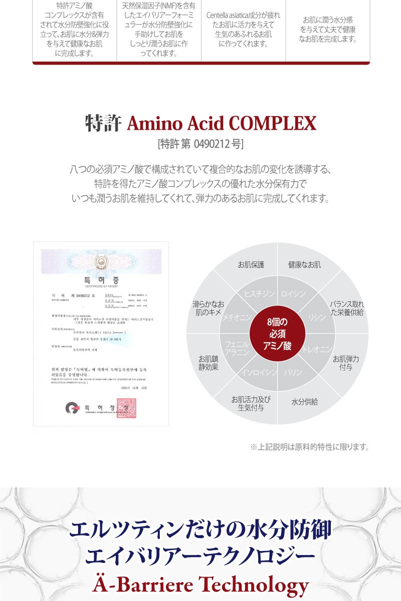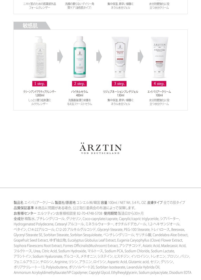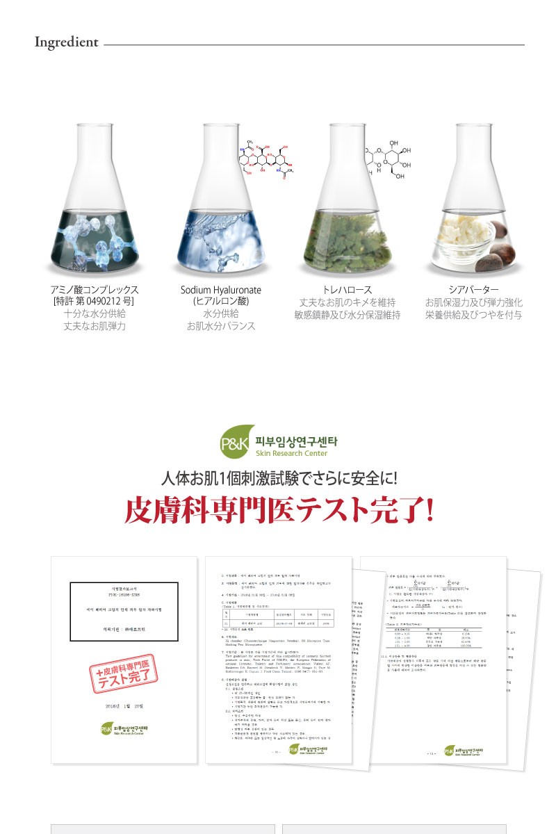 精製水、ブチレングリコール、グリセリン、ココ-カプリル/カプリン酸、(カプリル·カプリン酸)グリセリル、シアーバター、水添ポリデセン、セテアリルアルコール、ミネラルウォーター、オクチルドデカノール、1,2-ヘキサンジオール、ベタイン、C14-22アルコール、(C12-20)アルキルグルコシド、ステアリン酸グリセリル、ステアリン酸PEG-100、トレハロース、ミツロウ、ステアリン酸グリセリル(SE)、ソルビタンモノステアレート、ソルビタンセスキオレエート、ペンチレン グリコール、サリチル酸、キダチアロエ葉のエキス、グレープフルーツのエキス、ゆずのエキス、ユーカリ葉のエキス、クローブ花のエキス、クララ根 エキス、エブリコのエキス、アシアチコシド、アジア酸、マデカシン酸、フルクトース、尿素、クエン酸、水酸化ナトリウム、マルトース、ピロリドンカルボン酸(PCA)、塩化ナトリウム、乳酸ナトリウム、アラントイン、ヒアルロン酸ナトリウム 、グルコース、メチオニン、システイン、ヒスチジン、イソロイシン、トレオニン、プロリン、バリン、フェニルアラニン、チロシン、アルギニン、リシン、アラニン、ロイシン、アスパラギン酸、グルタミン酸、セリン、グリシン、ポリアクリレート-13、ポリイソブチレン、ポリソルベート 20、イソステアリン酸ソルビタン、ラハイブリダのオイル、(アクリル酸ジメチルタウリンアンモニウム/ビニルピロリドン)コポリマー、カプリリル・グリコール、エチルヘキシルグリセリン、ポリアクリル酸ナトリウム、ディソディウム EDTA