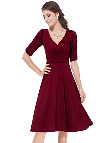 Sexy v neck cocktail dress. 3/4 sleeve style with ruffles. Simple, versatile design makes this dress appropriate for a wedding, a party, or casual wearing.