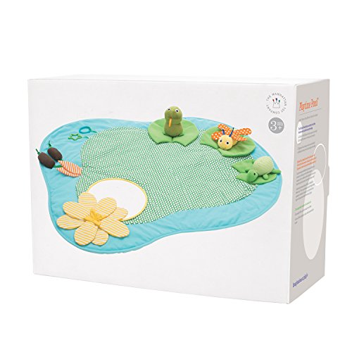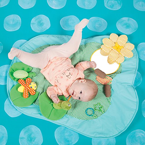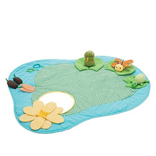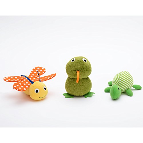 - Removable characters include a frog chime toy, rattle turtle, and dragonfly with crinkle paper wings