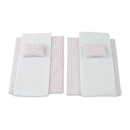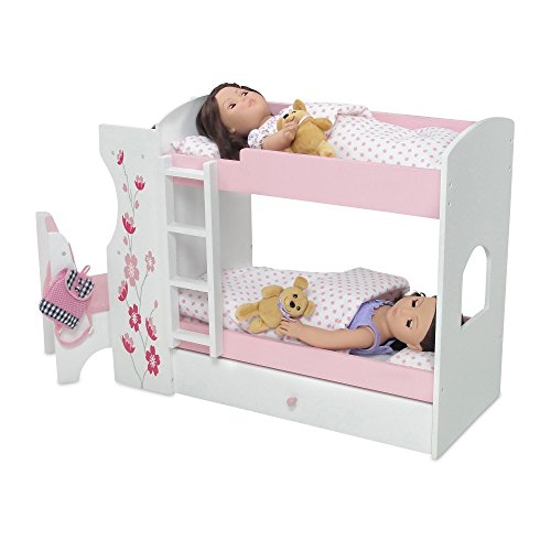 This amazing bunk bed combo piece is perfectly sized for your 18" doll's bedroom! Painted pink and white with a gorgeous, multi shade pink floral print, this bunk bed set comes with a built-in ladder, and each bunk includes a pretty pink polka dot blanket and pillow, plus a thick white mattress for a comfortable nights sleep! Under the lower bunk is a great drawer for storing doll clothes and doll accessories which can also double as a trundle bed during sleep over parties!! What make this piece ultra functional is the built in, perfectly sized desk and chair combo, with shelving to store extra doll stuff!! Painted wood furniture piece is CPSIA safety tested and approved, and suitable for 14-18 inch dolls (including 18 inch soft body dolls such as American Girl, Gotz, Magic Attic, etc.). Dimensions provided below are based on the fully assembled product. *Dolls And Accessories Not Included*Feature