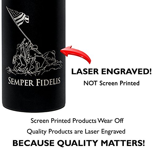 Our Marine Corps water bottle features two of the Corps' most sacred images - the Eagle, Globe, and Anchor; and the iconic Raising of the Flag on Iwo Jima. And you don't think we'd screen print this artwork, do you? Of course not. The images are laser-etched into the steel to remain forever as bold and crisp as they appeared on Day One.