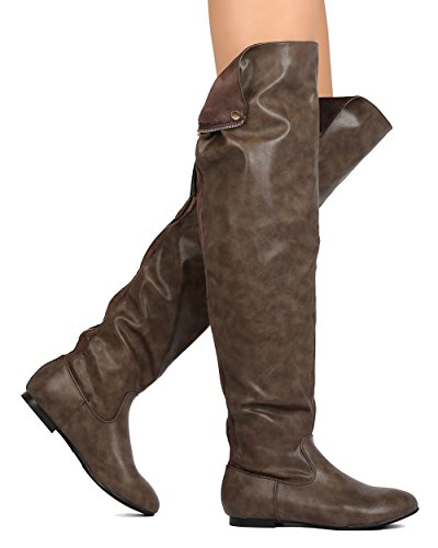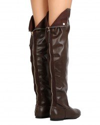 Product Description This statement over the knee boot is made with a leatherette upper and flat heel. Also made with a hind zipper and fold-able cuff at opening. Material: Leatherette (man-made). 0