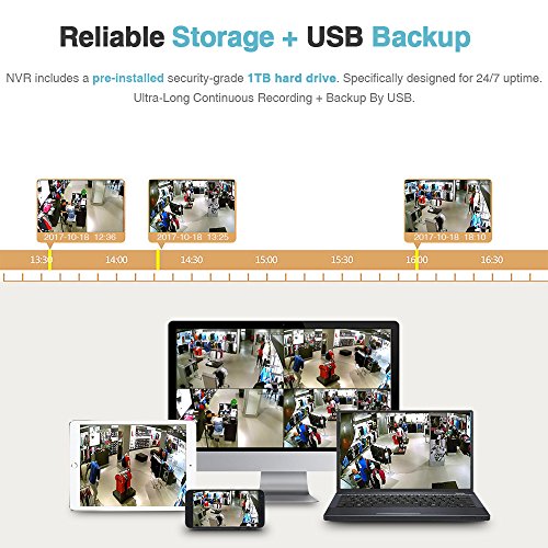 -. Feature : SIMPLIFIED POWER OVER ETHERNET- True PoE technology, a single network cable directly connects each IP camera to the NVR, supplying both power and video signal.No more video cable or camera power adapter is needed, much simplifying the wiring trouble. / QUICK REMOTE ACCESS- Connect your tablet or Smartphone to your IP cameras or NVR with the free app via QR Code Scan, available for both Android and iOS devices. / STUNNING EXPERIENCE: Crystal clear 1 Mega Pixels 720P 1280X720 Video at 30fps, 75° wide view angle lens.Free central management software, monitor different locations at one screen.Multiple recording modes, intelligent motion detection, email alert.Supports ONVIF compliant IP cameras. / DAY AND NIGHT FULL DAY MONITORING - Each IP camera houses premium IR LEDs inside of it and is capable of recording up 100ft / 30M super long night vision with auto IR-Cut switch.