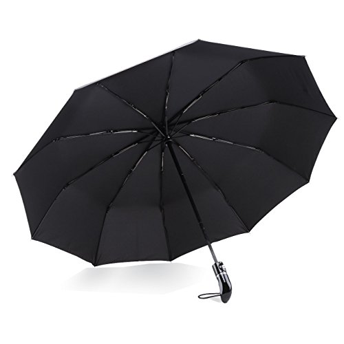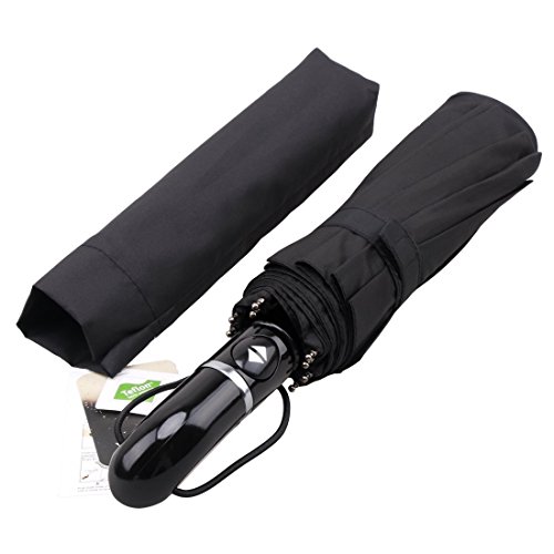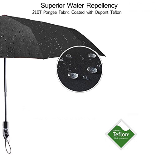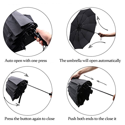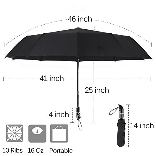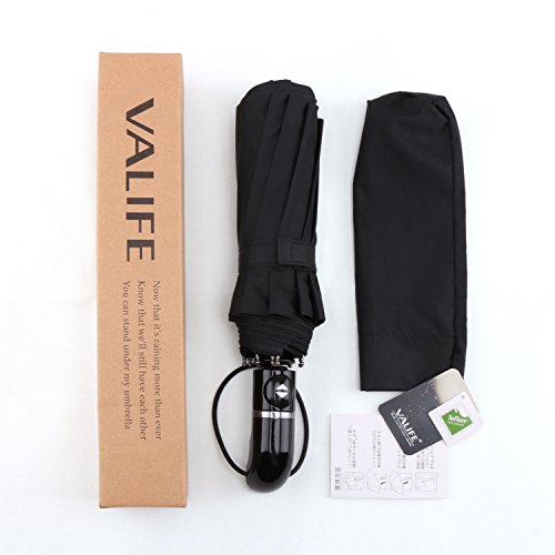 1:Optimum Water Repellency This waterproof umbrella made of 210T pongee fabric coated with Dupont Teflon technology is easy to shake off the raindrops so that you won't bring the rainwater back home. 2:Super Wind Resistance The combination of electroplated black steel shaft and the unique 10-rib reinforced fiberglass help you fight against storm easily. 3:Great Convenience Thanks to the automatic switch, you don't have to worry about being attacked by unexpected downpour through opening the umbrella in one second with little strength. 4:Comfortable Feel The handle of most umbrellas is thin and short.On the contrary, our handle is long and curved with figer-notches ,the appropriate size for the palms of American. You can't image how nice the handle is unless you touch it personally. 5:Portable and Light Weight Foldable to compact 13.4' and weights 16.2oz, so it's small enough and lightweight to tuck away in purses, backpacks, and luggage. Package Included: Valife Folding Umbrella * 1 Umbrella Case *1 Umbrella Box *1 User Manual * 1