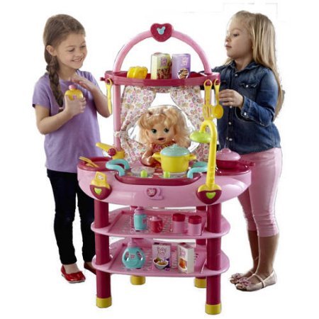 -. Feature : Plastic tray & frame with Polyester patterned curtains, featuring 28 assorted play pieces (4 cereal boxes, 4 plates, 6 bottles & Jars, 12 utensils & 2 Pots & Pans)