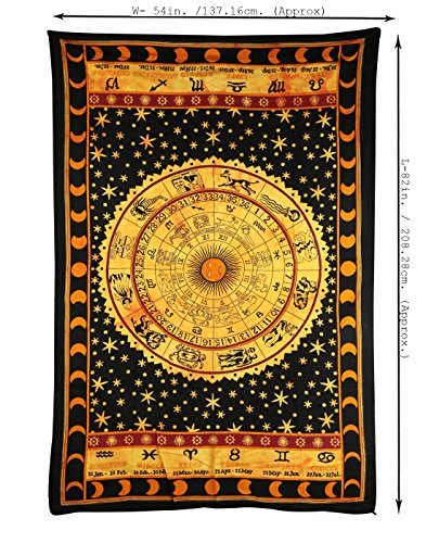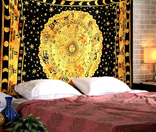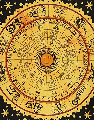 Rajrang Black Zodiac Horoscope Tapestry, Indian Astrology Hippie Wall Hanging, Ethnic Decorative Art, Celtic Zodiac Tapestry