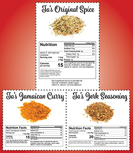 -. Feature : TA'S ORIGINAL FRESH SEASONING MIX WILL BE A DELIGHT TO YOUR SENSES. The aroma of this fresh ground all purpose spice blend will pull you in and the taste will seal the deal. This multipurpose Caribbean inspired spice mix is the perfect seasoning blend of fresh spices for a satisfying taste every time! All of our ingredients in this gourmet spice are dehydrated to help retain the quality of the ingredients. Spice up any meat, chicken, fish, sausage or veggie dish! Perfect for grilling too! / JAMAICAN CURRY SEASONING IS TRADITIONAL TO THE JAMAICAN CULTURE! One of the favorite dishes among people in the islands! Our Jamaican Curry Powder is a spice and seasoning that has a bit of a kick to it; and it's delicately infused with scotch bonnet peppers. Perfect spice selection for Curry Chicken, Curry Shrimp, Curry Vegetables, or the traditional Curry Goat. If you are looking for traditional Jamaican Curry, you've found it! / UNIQUE JERK SEASONING GOURMET SPICE FLAVOR WILL HAVE YOU THINKING YOU ARE ON THE BEACHES OF THE CARIBBEAN! Jerk Seasoning is a long standing tradition in Caribbean Cuisine. Our gourmet Jerk Seasoning is an authentic recipe that has been passed down through the generations. This savory spice seasoning rub can be used by itself, or you can follow the simple instructions on the recipe card to make your very own traditional Caribbean Jerk Marinade! Enjoy this unique healthy food seasoning! / COMPLETE GOURMET SPICE BLENDS KIT - Distinctive, versatile and savory! Caribbean all purpose spices - Perfect for any BBQ or baking dish you choose. SP.R.Inkle on and simply sit back and allow these unique spices enhance your next dish or vegetables selection / PERFECTLY PACKAGED NOTABLE SPICE SEASONING GIFT SET - Let the spices come to life and taste this special blend of Caribbean herbs with this limited gourmet spices gift set - Includes multipurpose Ta's Original Spice, Jamaican Curry, Jerk Seasoning with easy to hold wooden spice spoon for perfect measurement every time and versatile measurement magnet that can be used for any of your desired creations!