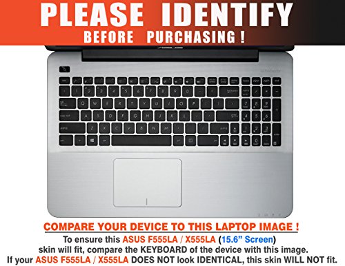 -. Feature : Made for the Asus F555LA / X555LA (15.6" Screen) laptop only. Device not included / Please refer to the "Identify" image on this listing to ensure this skin will fit your device. / Durable, high quality adhesive vinyl stickers; this product is NOT A HARD COVER or made of rubber, silicone, gel, or plastic. / Image colors may vary depending on your monitor settings. / Easy to apply without any liquids / solution. To remove, simply peel it off slowly with your bare hands, leaving behind no sticky residue!