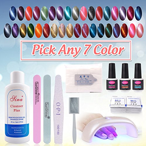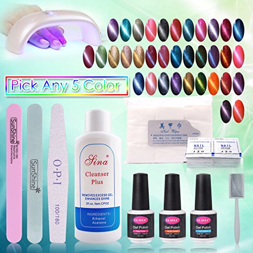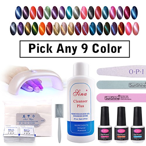 PACKAGE:19pcs Gel polish starter kit,9pcs color gel polish,1pc top coat 1pc base coat,1pc 9w led nail dryer, 7pcs nail art tools and accessories