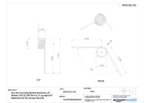 Music Wire Torsion Spring, Right Hand Wind Direction, 120° Deflection, 0.926" OD, 0.085" Wire Size, 2.5" Leg Length, 0.625" Mandrel Size, 0.652" Min. Axial Space (Pack of 10)