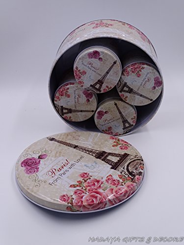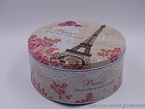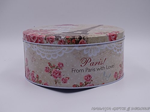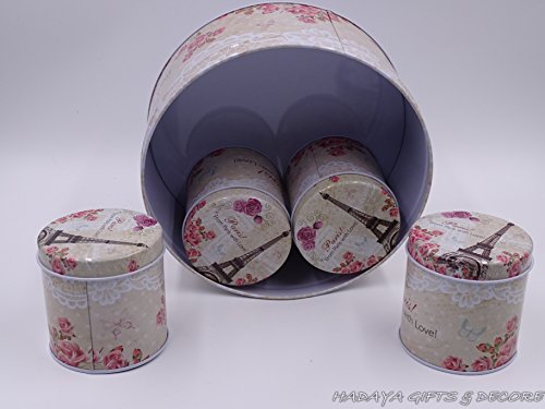Attractive Paris Themed Cookie Storage Tins, Shabby Chic, Floral Design, with Eiffel Tower, Big Round Shaped Box with 4 Small Boxes