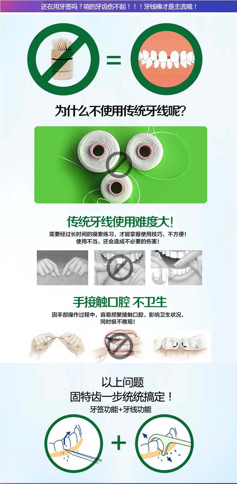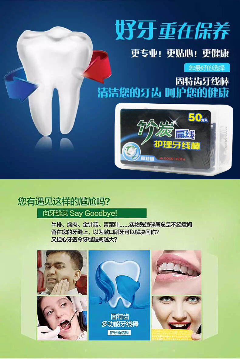 固特齿 竹炭扁线护理牙线棒牙线签 竹炭吸附高拉力50支盒装*4盒