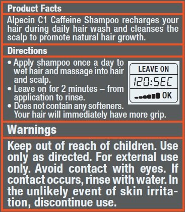 Application: Apply the Alpecin C1 Caffeine Shampoo once a day to wet hair and massage into your hair and scalp. Leave on for 2 minutes - from application to rinse. The Alpecin Caffeine Shampoo does not contain any softeners and your hair will immediately have more grip.