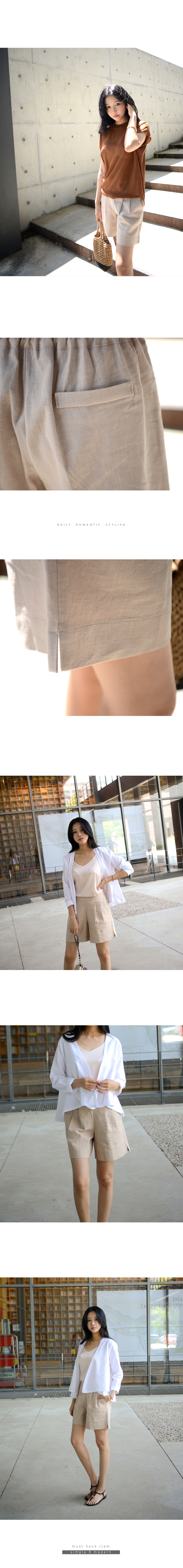 린넨 100%에 톡톡한 소재감과 반듯한디자인으로 고급스러운 반바지에요과하게 짧지 않고 밑단을 넉넉히 잡아반듯하게 형태를 잡아줘 입었을때 핏이잘 정리되는 깔끔한 핏의 팬츠랍니다앞허리는 단정하게 오비처리 되어있고뒷허리는 밴딩으로 사이즈에크게 구애받지 않고 편하게 입기 좋아요색상은 화이트, 베이지, 네이비사이즈는 FREE 44~66반▼ 관련상품 : 마티스 코튼 티셔츠분 캡소매 린넨니트플랜 플레어 린넨 가디건