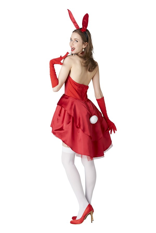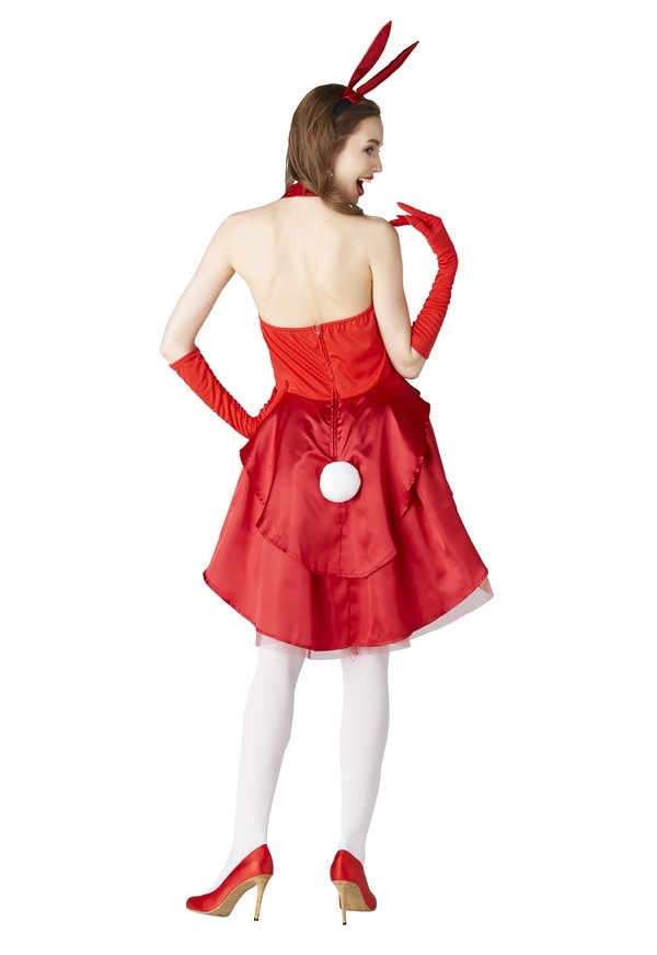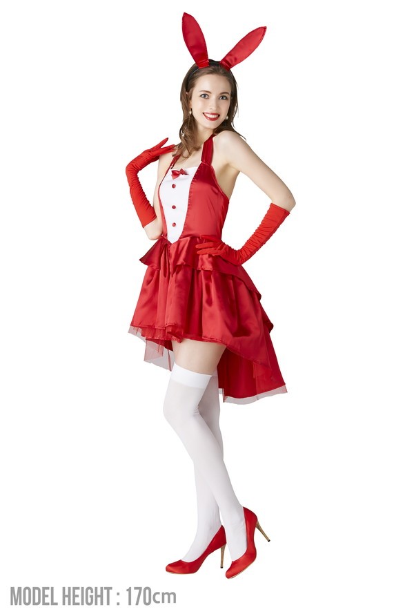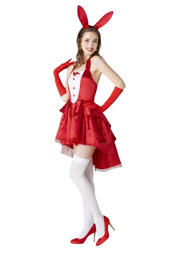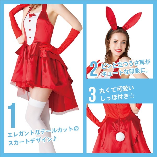テールカットのスカートがエレガントな印象のバニーコスチューム♪情熱的な赤色が普通のバニー衣装に飽きたという方にもおすすめです。カチューシャのうさ耳は針金入りだから、好きに曲げて着用してね!丸くて可愛いしっぽ付き?