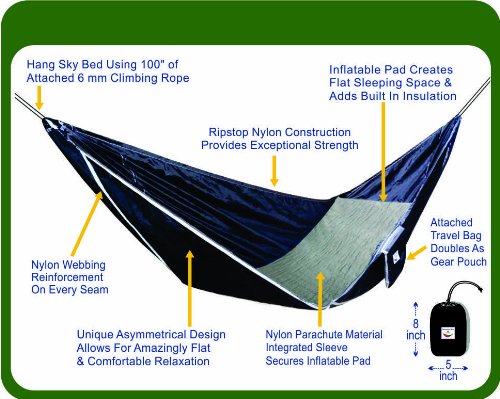 - Title : Hammock Bliss Sky Bed - Hangs Like A Hammock But Sleeps Like A Bed - Unique Asymmetrical Design Allows For An Amazingly Flat and Comfortable Sleeping Space - 100" Of 6mm Climbing Rope Included Per Side
