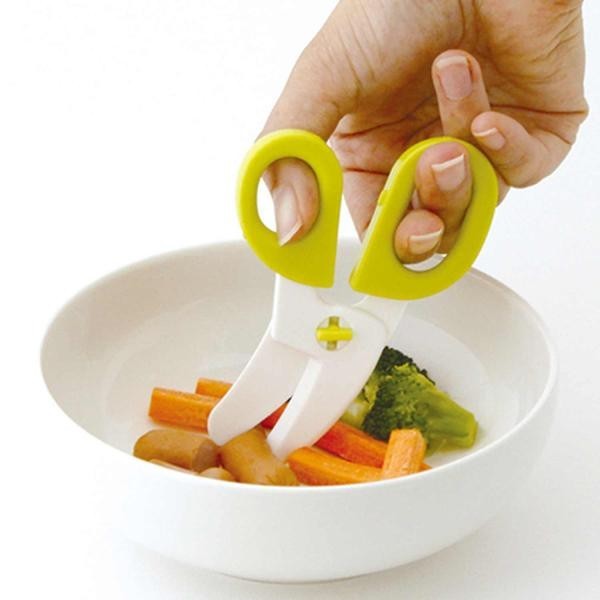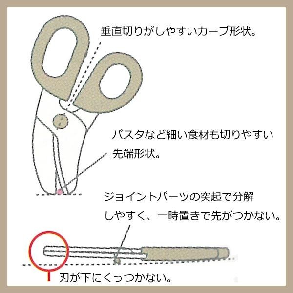 お箸では切りにくい麺類、野菜、お肉などもサクサク簡単にカット出来ます。ハサミがカーブしているので、具材が逃げず、テーブルの上に置いても刃先が付かない形状になっています。持ち運びに便利なケース付き!! |