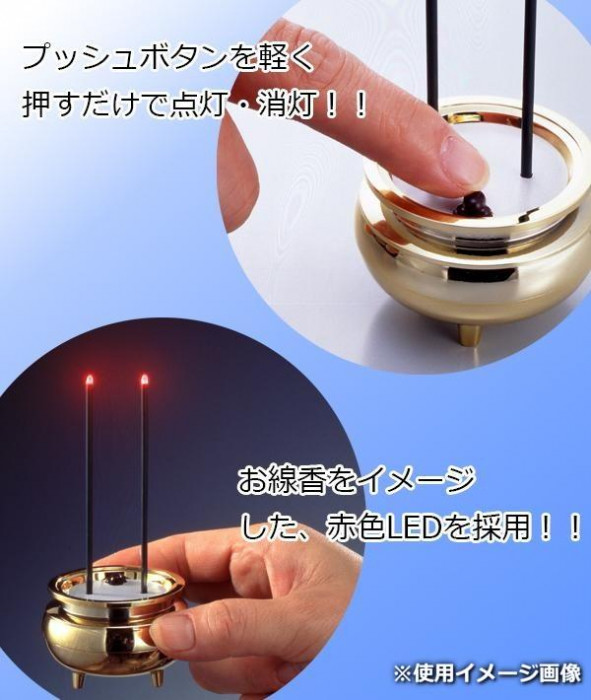| 火を使わない電子の炎で、倒れても大丈夫なお線香です。 |