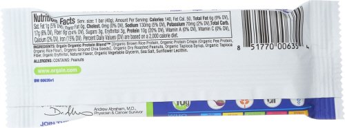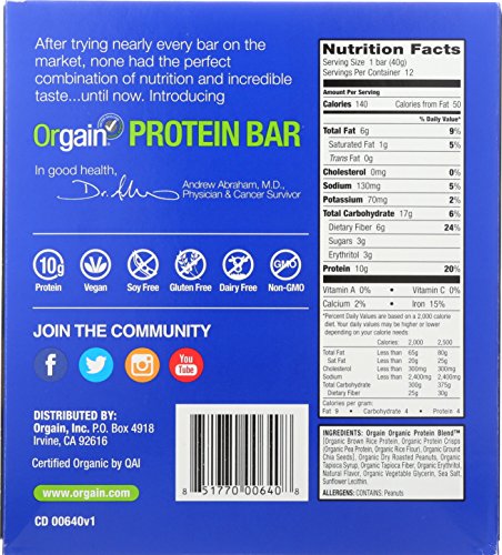 ReleaseDate : 2016-06-27 Studio : Orgain Publisher : Orgain Binding : Grocery Product Description Orgain Organic Peanut Butter Protein Bars are the perfect, on-the-go protein snack with 10 grams of organic, plant based protein, 6 grams of organic fiber, and just 3 to 5 grams of sugar per bar. Vegan, Gluten Free, Soy Free, and Non-GMO. No artificial flavors, colors, or preservatives. 0