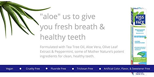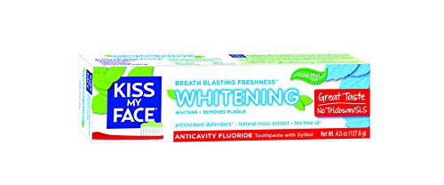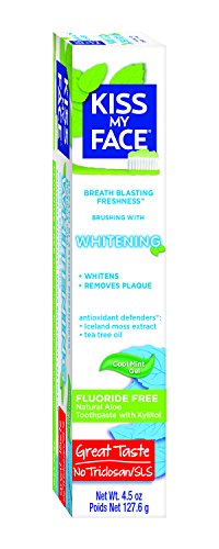 -. Binding : Health and Beauty -. Brand : Kiss My Face -. EAN : 0028367842354 -. Feature : Breath blasting freshnessTM / Antioxidant defenders Icelandic moss & tea tree / Helps removes plaque with xylitol & tea tree / Whitens with Icelandic moss / Triclosan free, no artificial flavor or sweeteners, cruelty free -. Label : Kiss My Face Corp -. Manufacturer : Kiss My Face Corp -. PackageQuantity : 1 -. ProductGroup : Pantry -. ProductTypeName : HEALTH_PERSONAL_CARE -. Publisher : Kiss My Face Corp -. Studio : Kiss My Face Corp -. Title : Kiss My Face Gel Teeth Whitening Toothpaste, Fluoride Free Toothpaste, 4.5 Ounce -. UPC : 028367842354