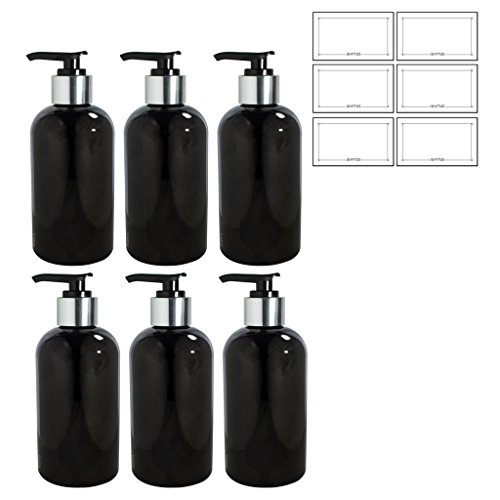Includes 6 - Black 8 oz Boston Round Refillable PET (BPA Free) Plastic Bottle with Shiny Silver / Black Lotion Pump Top and 6 White Labels