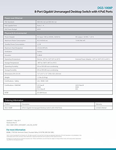 The DGS-1008P 8-Port Gigabit Unmanaged Desktop Switch with 4 PoE Ports enables office users to easily connect and supply power to Power over Ethernet (PoE) devices such as IP cameras, IP phones, and wireless access points (APs). The eight Gigabit ports provide connectivity for devices and applications that require high speed network access, and reduce bottlenecks that can interrupt communication. Ports 1 – 4 are 802.3af/802.3at PoE compliant, support up to 30W per port, with a total PoE power budget of 68 watts.Feature