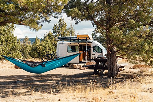 MAXIMUM SPACE AND COMFORT: The Roo hammock spreads to 10'L x 5'7"W, opening to the size of a queen bed. Comfortably fits two people, or offers a spacious night’s sleep for one.