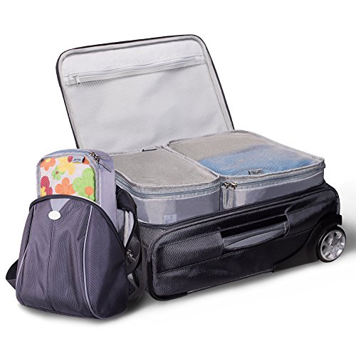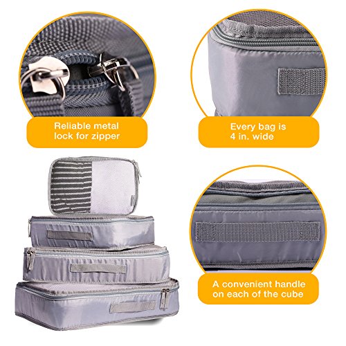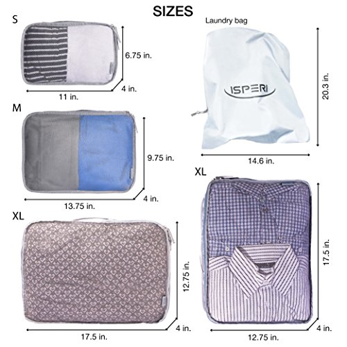 -Sizes: 2XL (17.5 x 12.75 x 4 inches), 1M (13.75 x 9.75 x 4 inches), 1S (11 x 6.75 x 4 inches), 1 Laundry bag (20.3 x 14.6 inches) -Why upend your entire bag just to find a top, pants or socks? Instantly fetch the cube hat contains the desirable item, only unpack that cube easily repack again - significantly reduced packing/unpacking efforts when you have to do it multiple times during a trip -Well-stored clothing doesn't wrinkle as much as loosely stuffed clothing in a backpack -Socks inner-wears do not need as much space as dresses bottoms - thus we offer multiple sizes for smart storage -Included laundry bag makes it easy to keep your moist, dirty or smelly clothes well separated from clean fresh clothes within the same bag -Easy airport security checks - pull out only the bag that security wants to inspect rather than showing them all your intimate contents, and feeling embarrassed -Unlike other shallow cubes, our cubes have 4" depth which allows for generous storage space -Heavy duty waterproof nylon fabric with strong metallic zipper head built-in lock loop -Smoothly running zippers and built-in handles ensure ease of use frustration-free experience -See-through mesh top to help you easily find which cube contains what yet without revealing the contents to others -Durable design - precisely done stitching and strong seams for incredibly long life