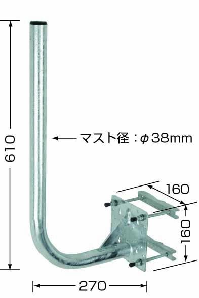 アンテナの取り付け時に使用する金具です サイズ 610×270mm 個装サイズ:65×65×20cm 重量 2.16kg 個装重量:2300g 素材・材質 溶融亜鉛メッキ仕上げ 仕様 はさみ込み寸法:20~100mm 最大幅寸法:100mm マスト径:φ38mm 製造国 日本 ベランダ格子手すり用取付金具 寸法図 アンテナの取り付け時に使用する金具です