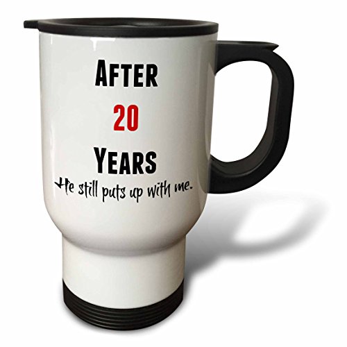 3dRose tm_213468_1 After 20 Years He Still Puts Up with Me, Black & Red Letters Stainless Steel Travel Mug, 14 oz, White