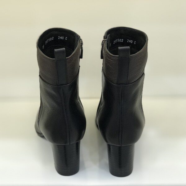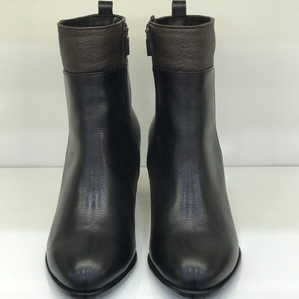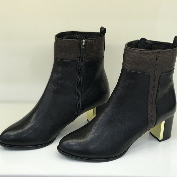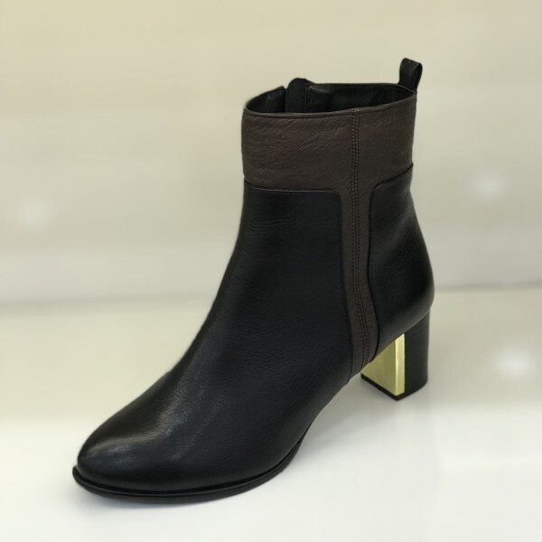 소재: 소가죽 굽: 6CM색상: 블랙윗 부분이 브라운으로 배색이 들어간 앵클부츠입니다.안쪽에 살짝의 기모가 있어 따뜻합니다.얇은 굽이 아니기때문에 편하며, 굽부분의 금장장식으로 한층 고급스러운 느낌을 주는 제품입니다.