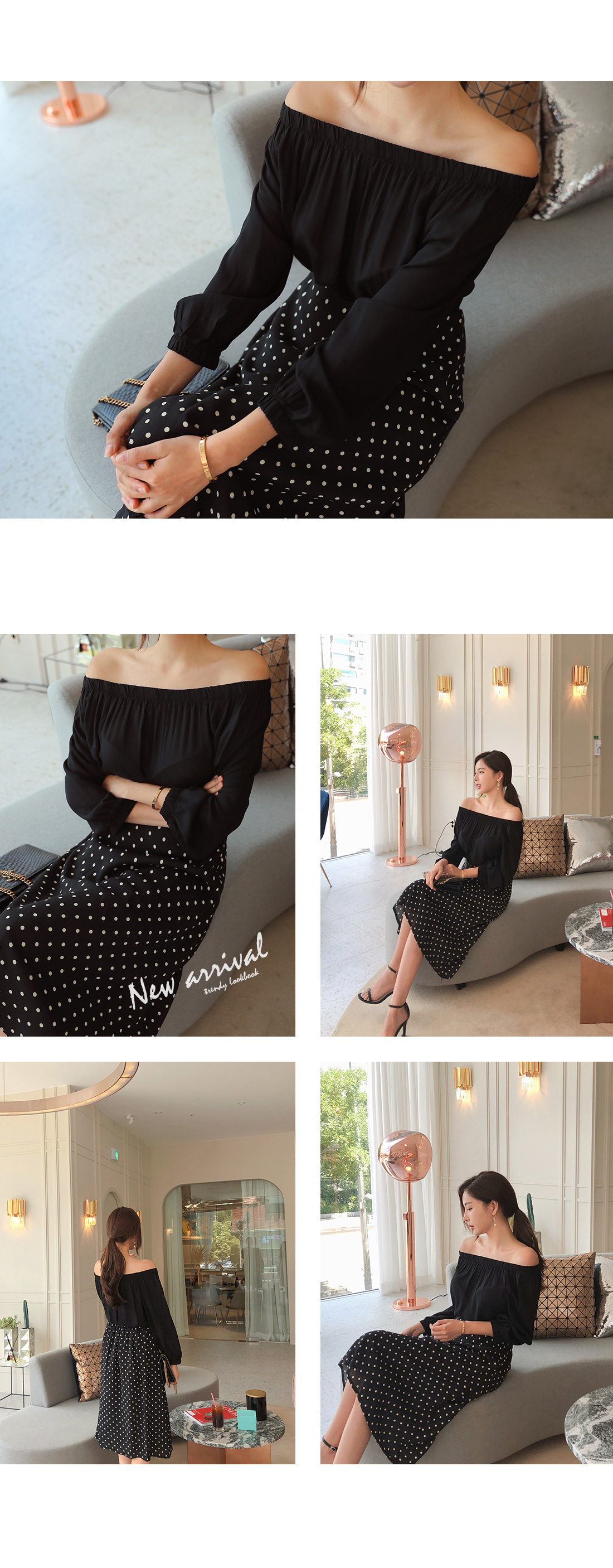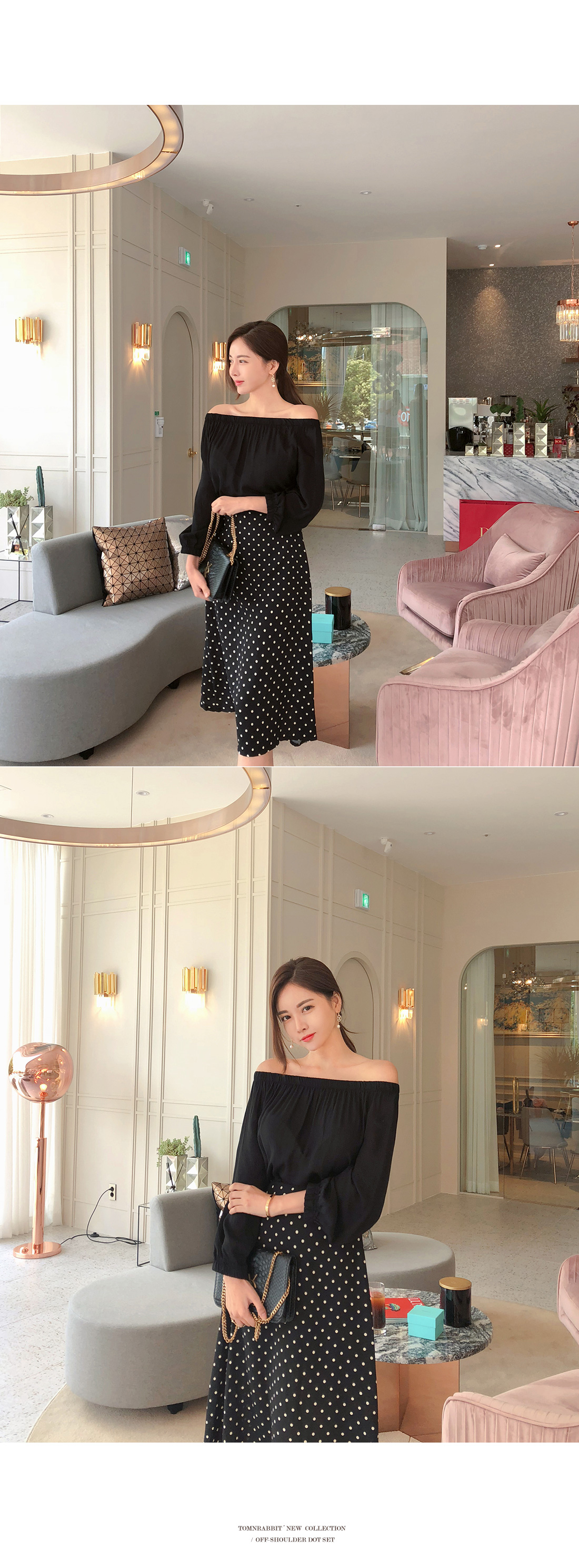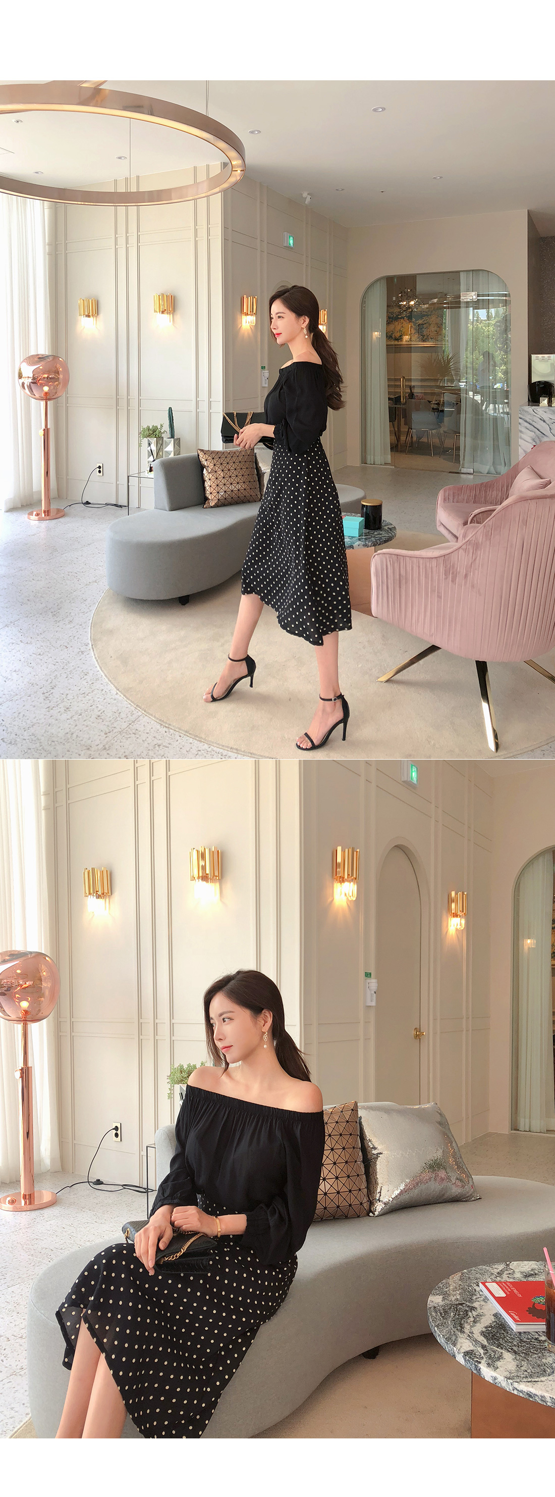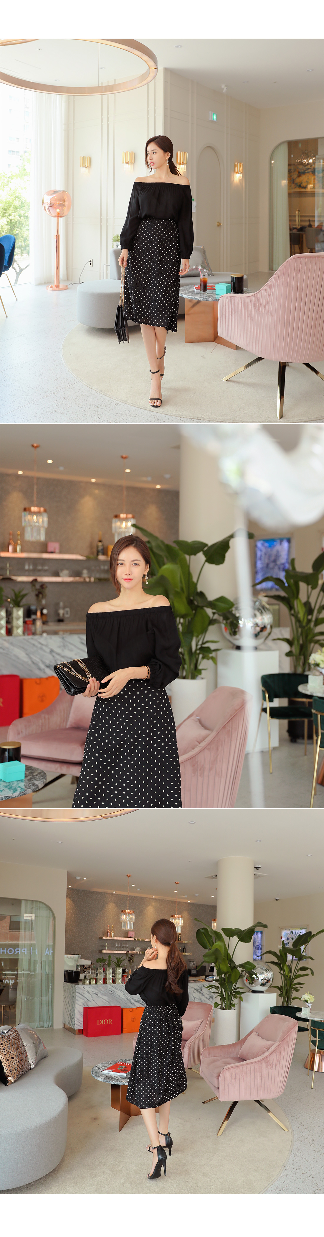 오프숄더 블라우스와 도트 스커트가