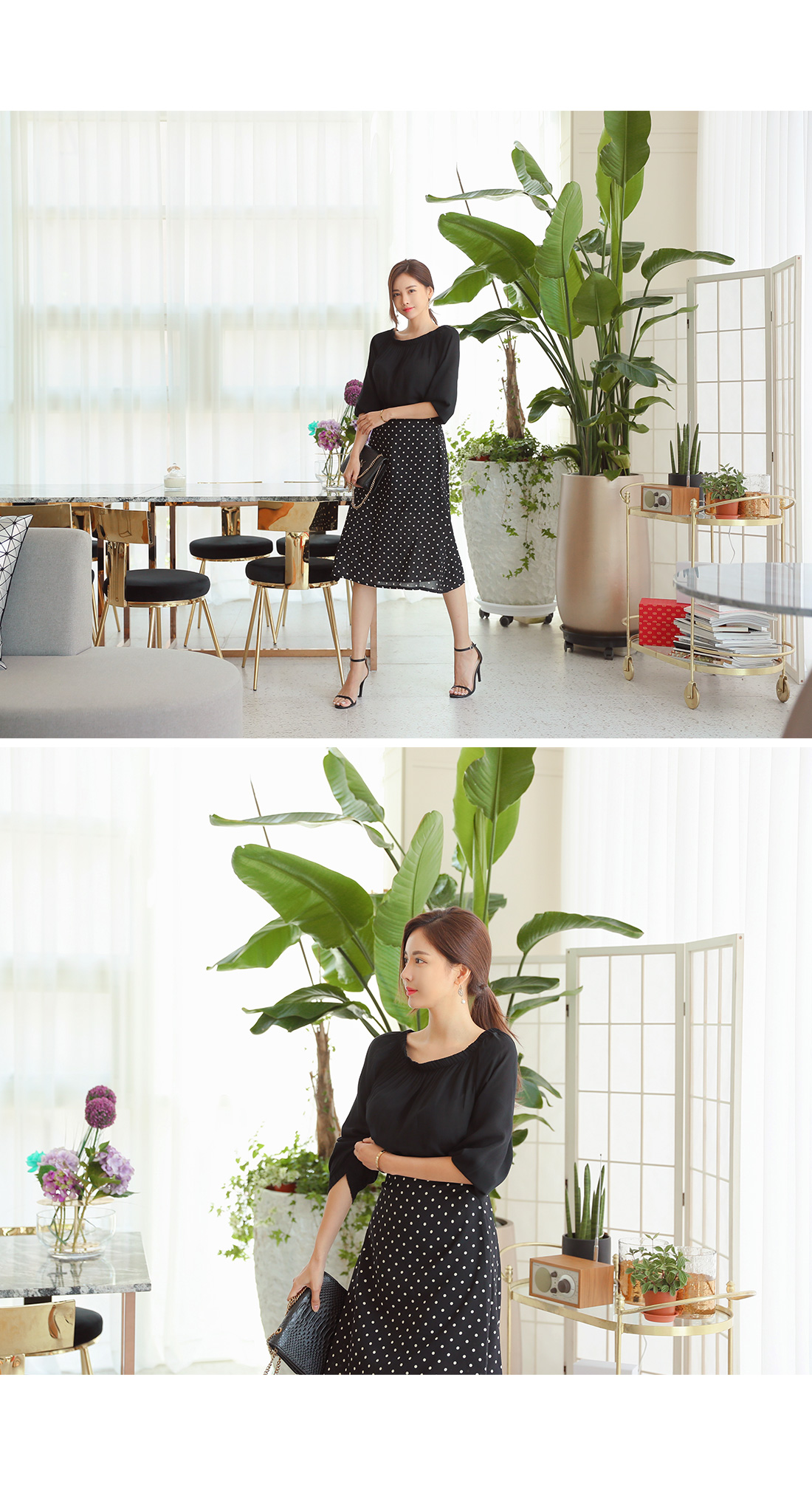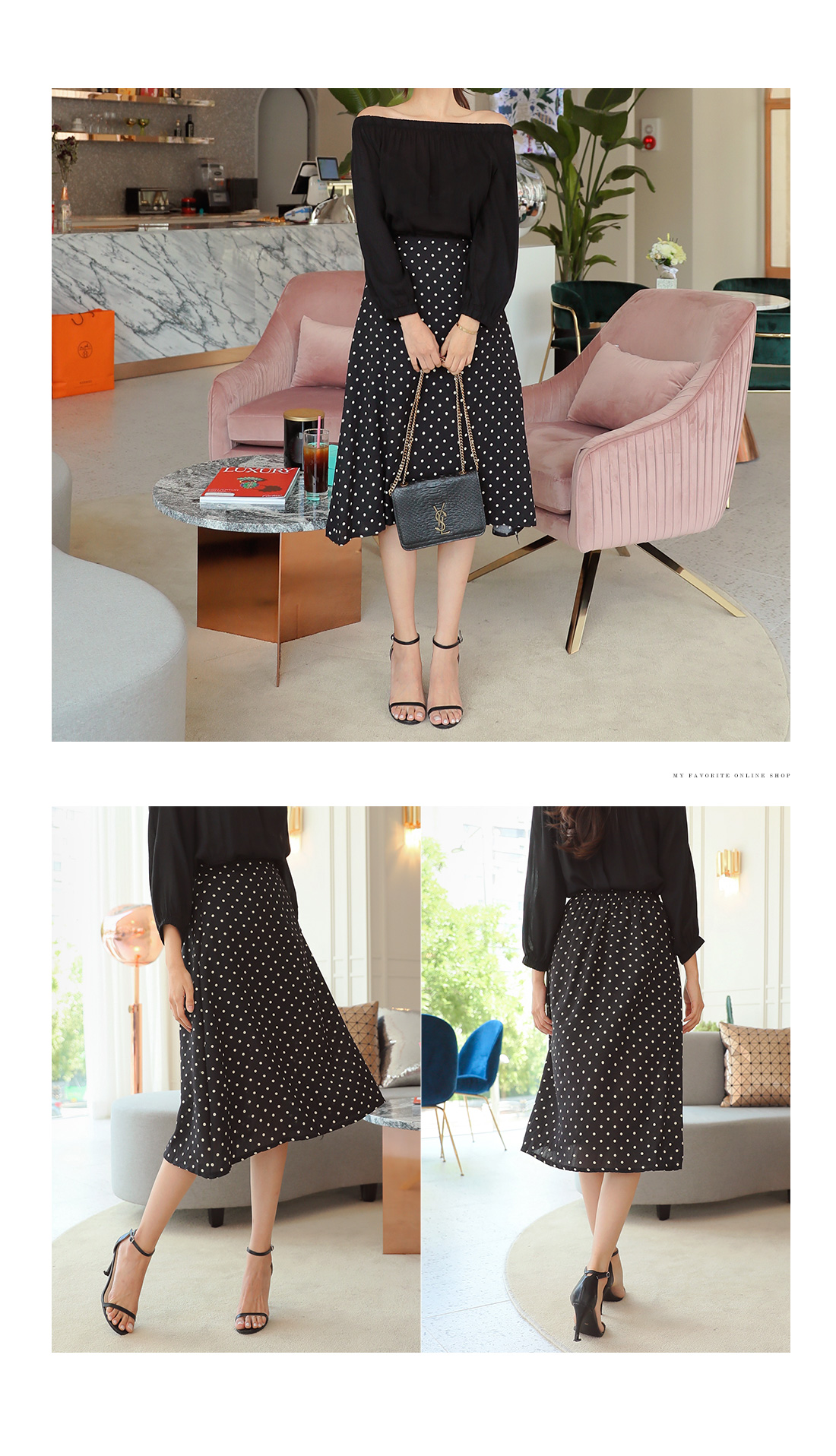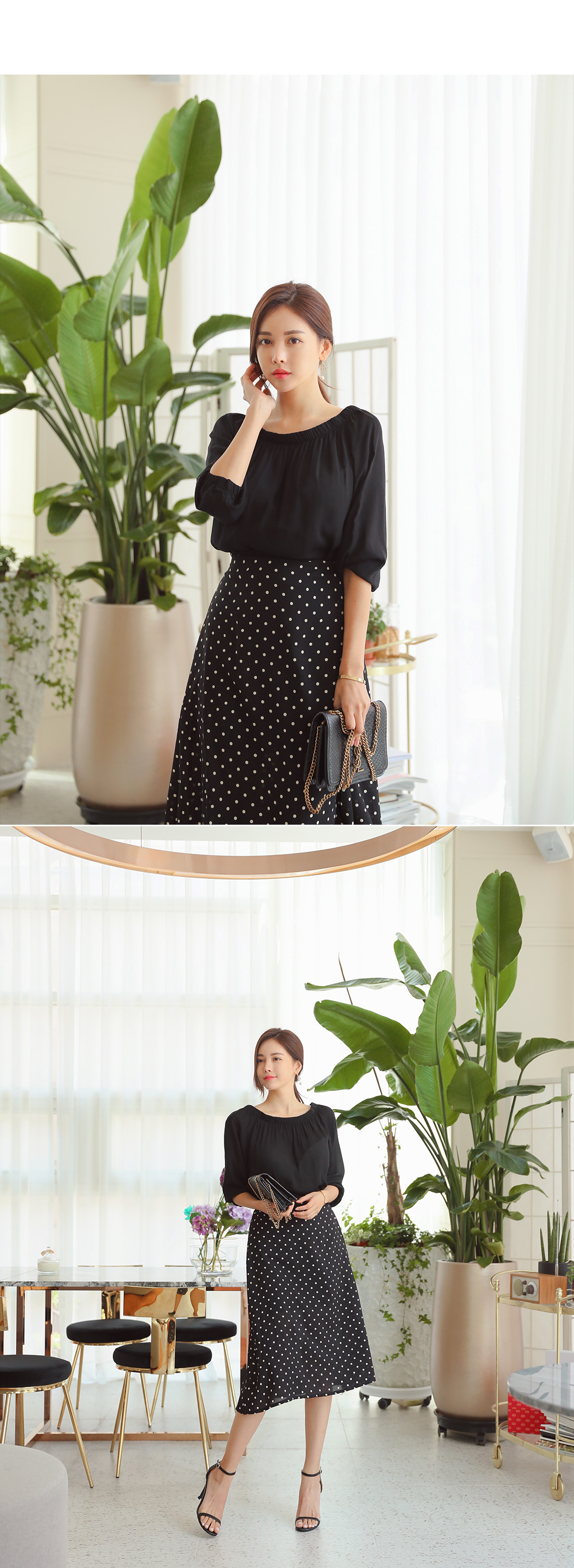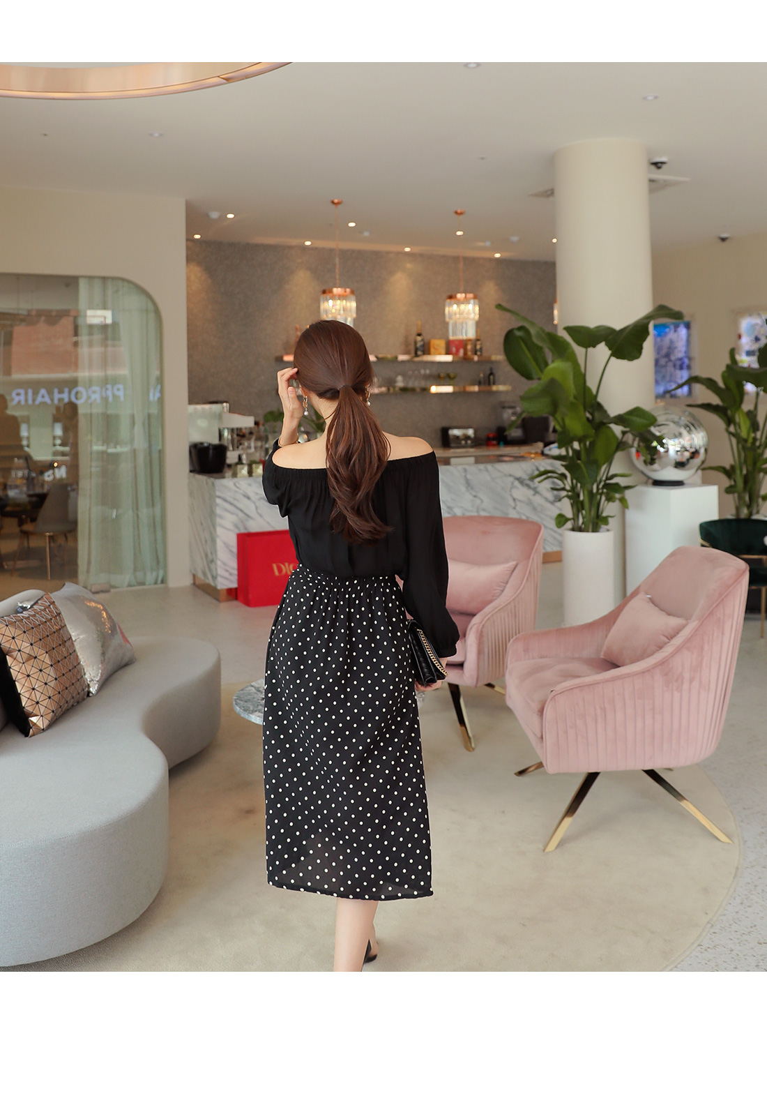 오프숄더 블라우스와 도트 스커트가