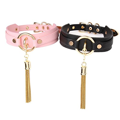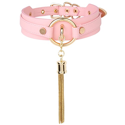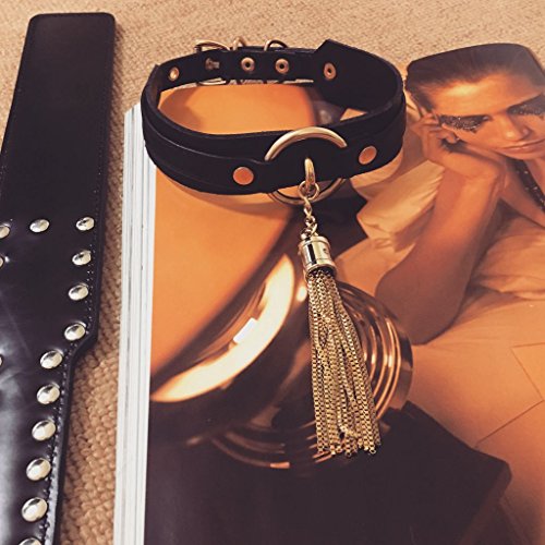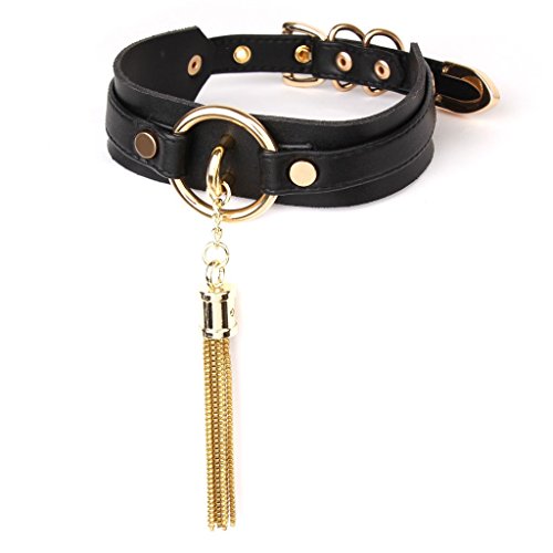 This cool choker is made with super quality vegan leather and alloy, centered with gold plated tassel and o ring, with a delicate buckle which clasps at the back of the neck.