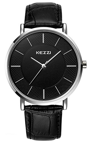 The basic black-silver design of the Kezzi Men's Analog Classic Watch makes it a simple, versatile timepiece great for everyday wear. The watch is constructed with a silver ultra-thin stainless steel case ,a silver stationary bezel, a silver selector and a comfortable black leather strap with an adjustable buckle clasp. A durable mineral window protects the black wheat-shading dial face, which cleanly features white hour indexes, and complementary white watch hands.