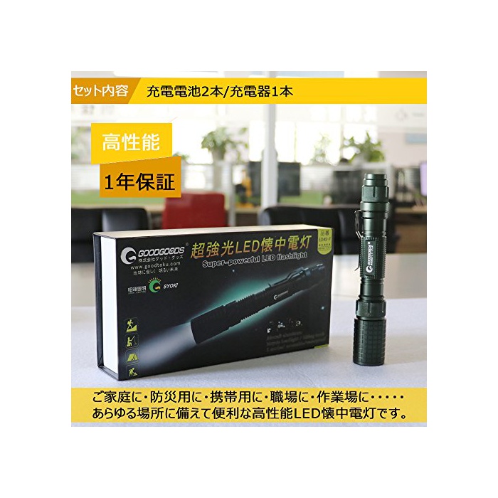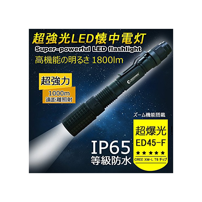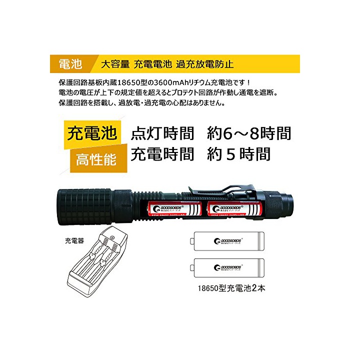 원본상품명: GOODGOODS LED 中電 充電式 力 超輝度 ズム機能 CREE XML-T6 1800LM 18650電池 サチライト 5モド 防水 長命 アウトドア 防災グッズ 夜釣り 【一