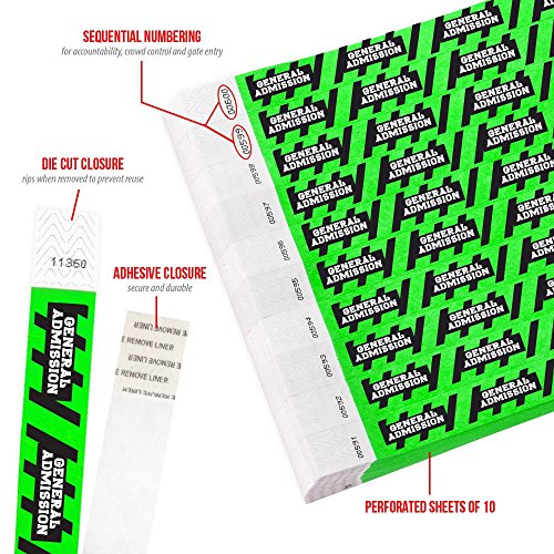 -. Feature : Waterproof / Non Transferable / Strong Adhesive Closure / 500 wristbands in sheets of 10
