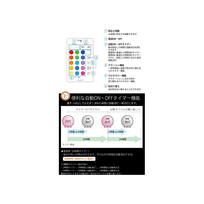 자동 점등&소등 타이머 기능 첨부 와.2시간과 6시간후의 자동 소등을 설정 할 수 있는.다음일은 설정 했을 때각에 자동 점등