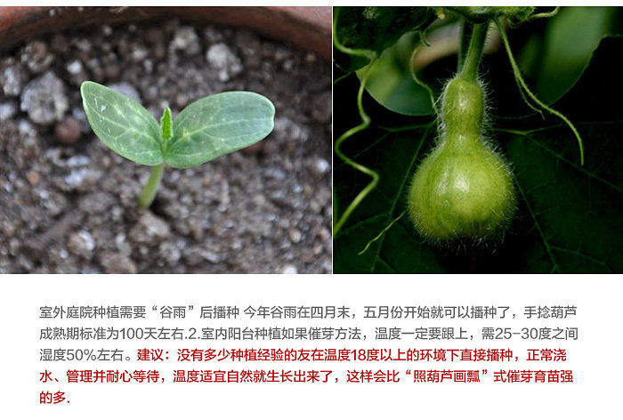 Hoist is thermophilic plants, seeds begin to sprout 15 ℃, 20 ~ 30 ℃ suitable temperature for the germination, 30 ~ 35 ℃ fastest germination, growth temperature for 20 ~ 30 ℃, 15 ℃ or less poor growth, stop growing below 10 ℃ below 5 ℃ began to suffer. Gourds are short-day plants, requiring a strong light, less disease under adequate light conditions.