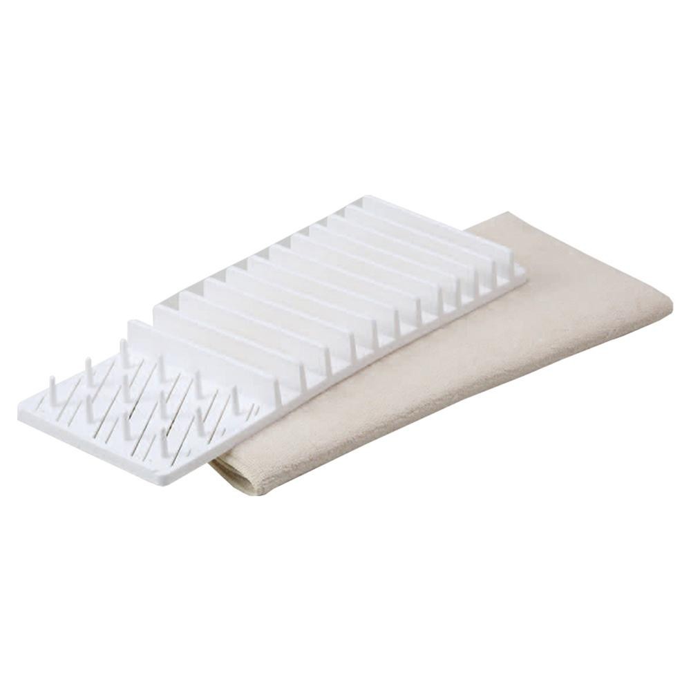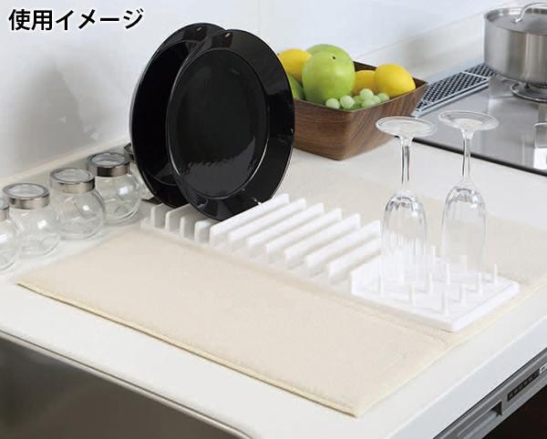 | 乾燥用ラックとマイクロファイバー製のマットで、キッチンの洗い物を立てて乾かすことができます。 |