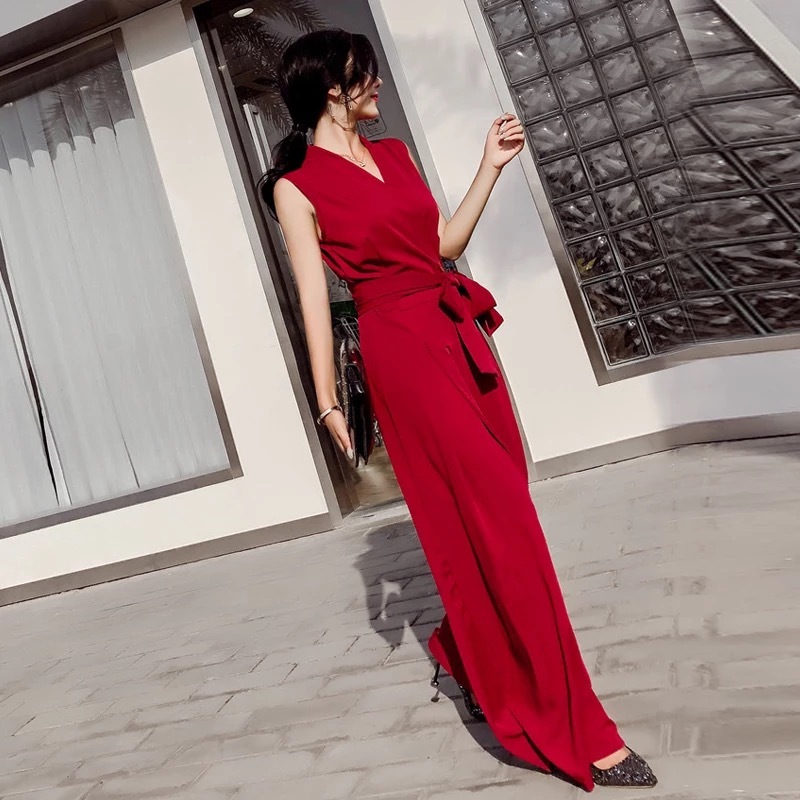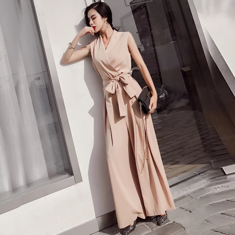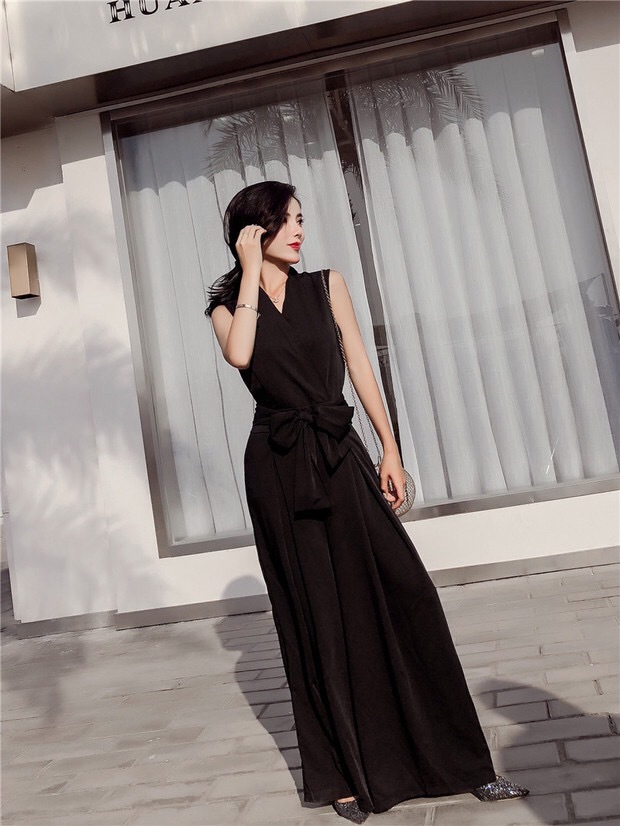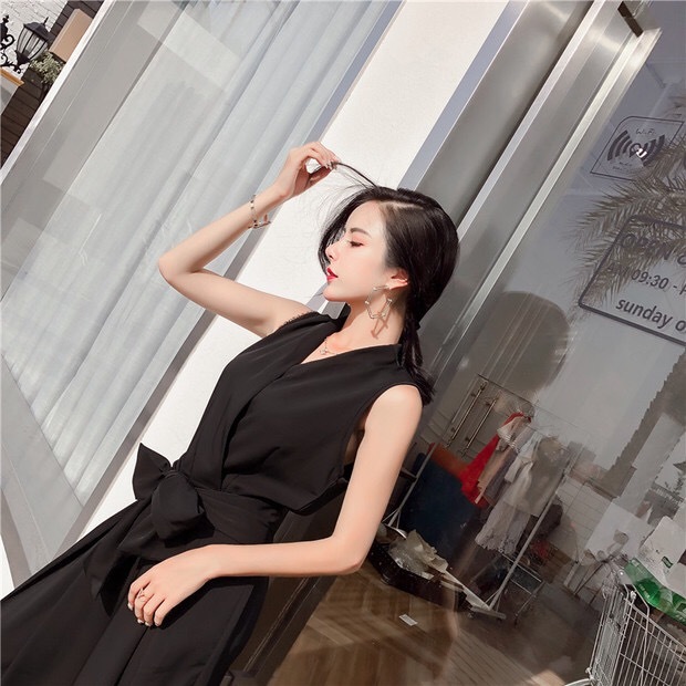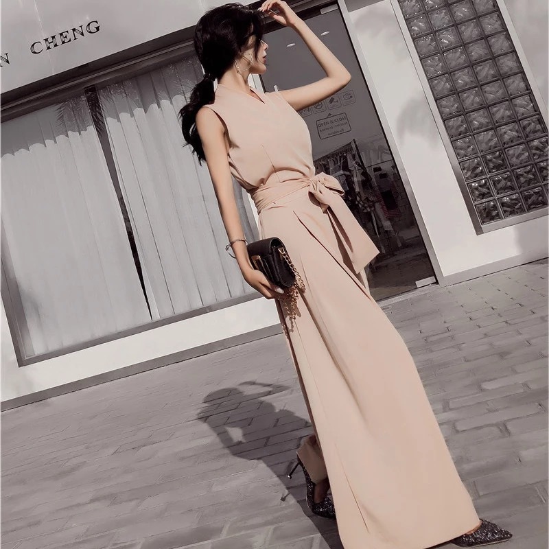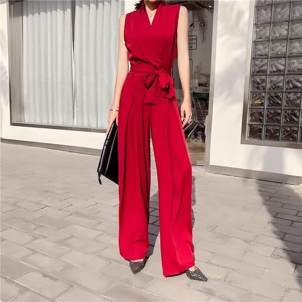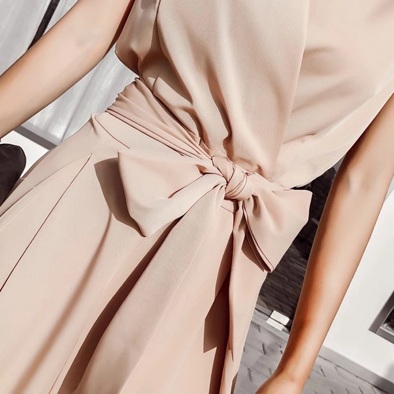大きなウエストリボンがポイントのノースリーブオールインワン。