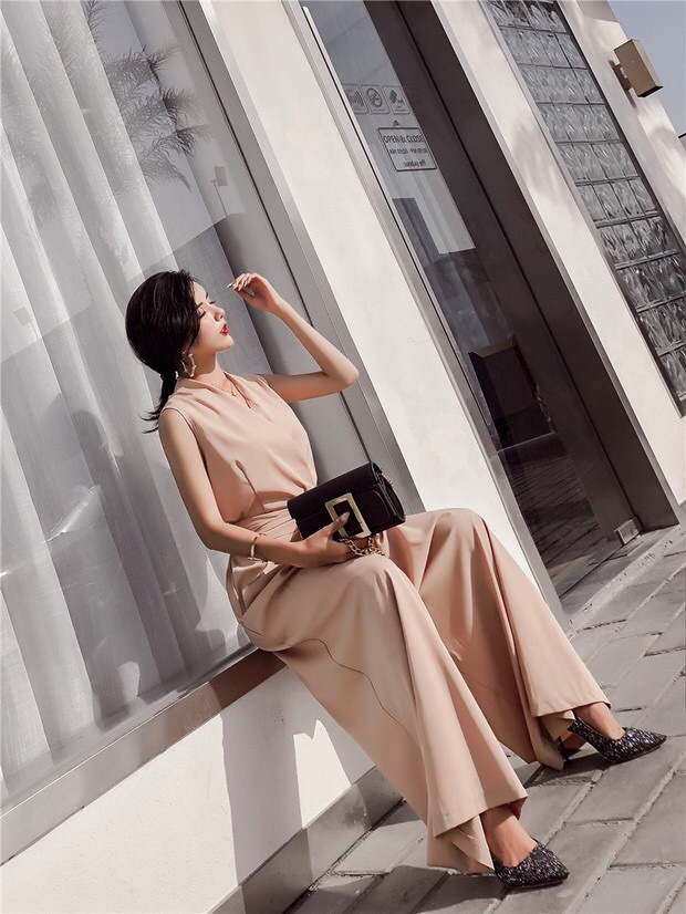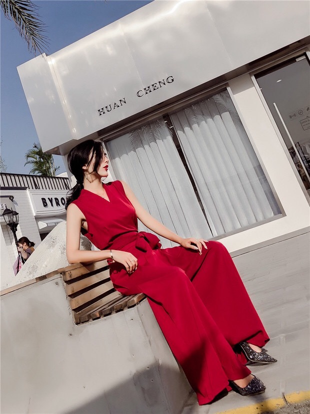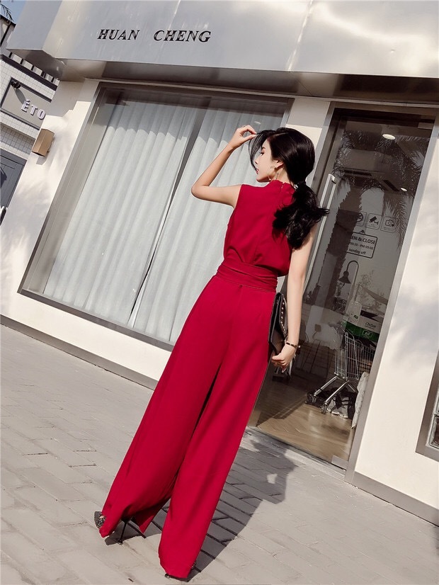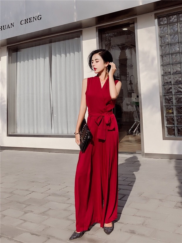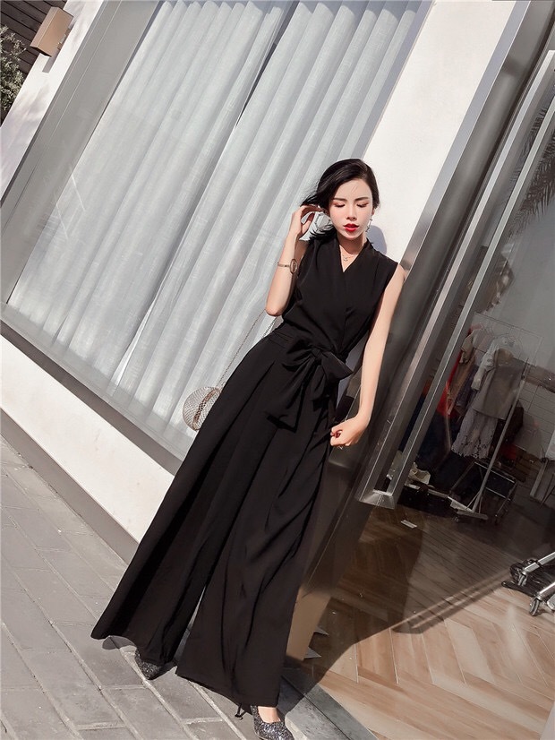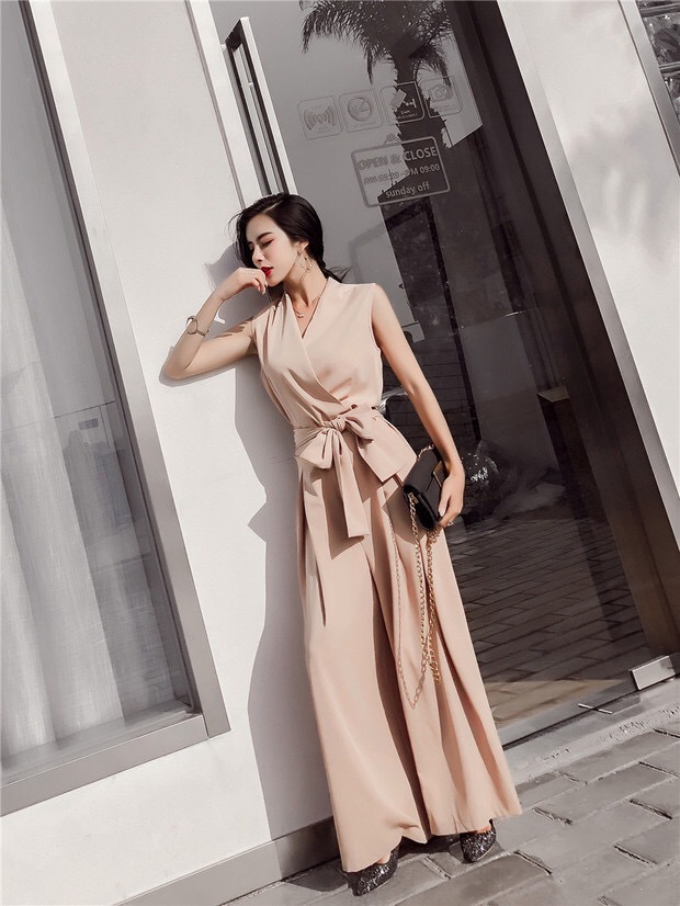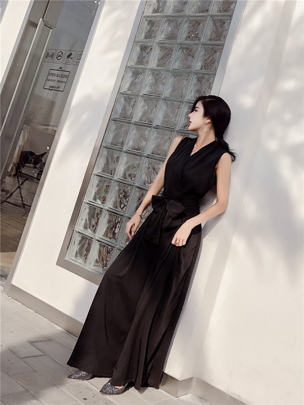大きなウエストリボンがポイントのノースリーブオールインワン。