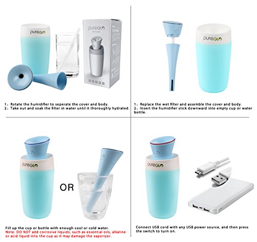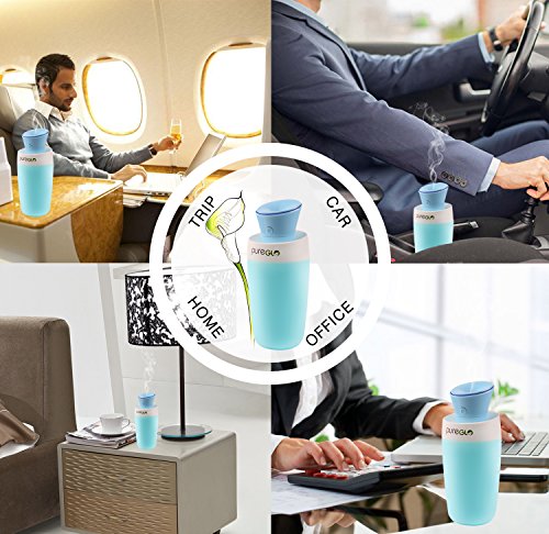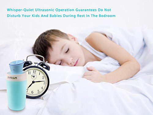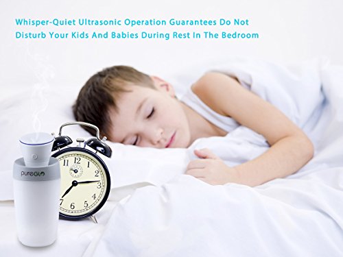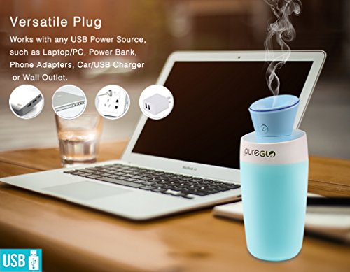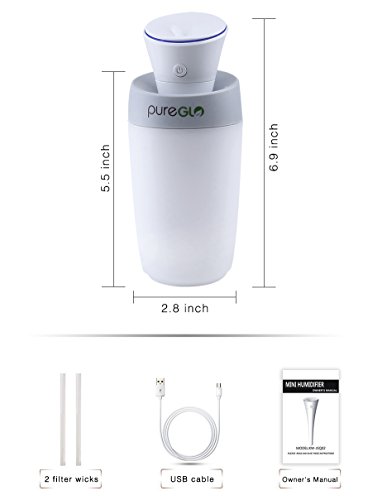 -. Title : pureGLO USB Mini Humidifier - 250ML Ultrasonic Cool Mist Travel Portable Air Purifier - Quiet Personal Humidifier for Car Office Baby Room with Bottle Cup
