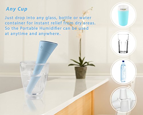 -. Feature : REFRESHES: Good stream of water mist freshens the air to ensure your ability to breathe comfortably. High frequency ultrasonic technology moisturizes the dry air which alleviate your dry eyes, dry thoat, dry and cracked skin from lack of humidity. / WHISPER QUIET: Quiet operation (less than 15db) guarantees do not disturb you through work or rest. Perfect for Car, Office, Baby Room, Bedroom or Yoga. / PERFECT TRAVEL SIZE: Ultra-compact design takes up almost no room in your suitcase, fits in briefcases or shoulder bags, set up in your car. Applicable to any water container. Comes with a water cup for added stability and keeps water clean from dust and lint. / VERSATILE: Versatile plug in options with AC/DC and never be limited by AC adapter. USB Cable will provide you flexible options for using the humidifier in your Office Desktop, Cubicle, Car or Hotel. / AUTOMATIC SHUT-OFF: 8 hours automatic power-off protection prevents working under water shortage for a long time. 30 Day Money Back and 24 Month Replacement Warranty!
